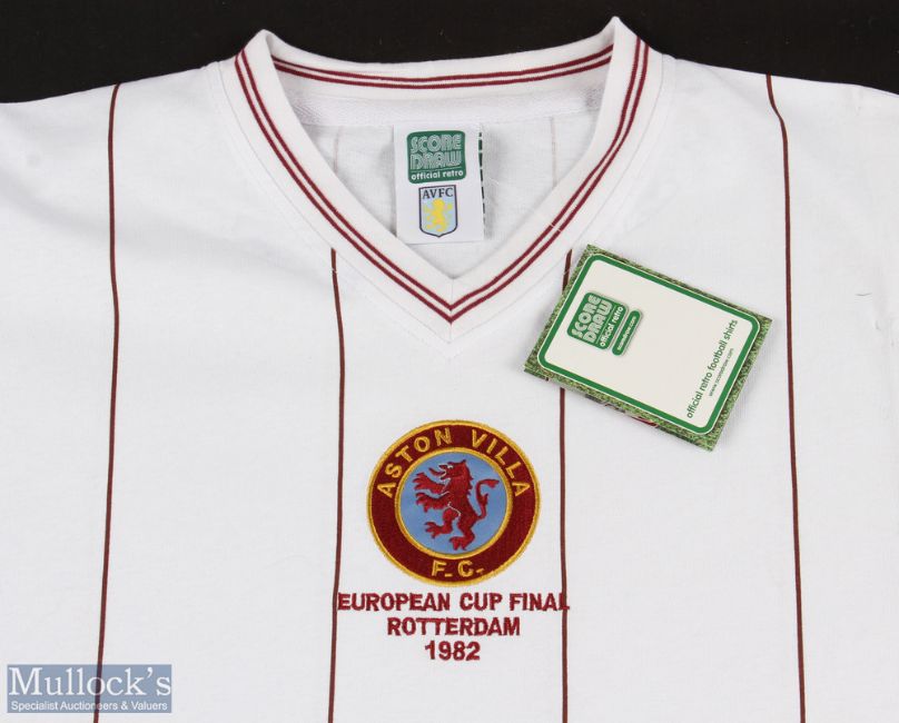 1982 European Cup Champions Retro Shirt Cap with signed photograph od Dennis Mortimer holding the cup. The shirt is size L - made by score draw official retro for Aston villa, mounted on card with pins, ready to frame