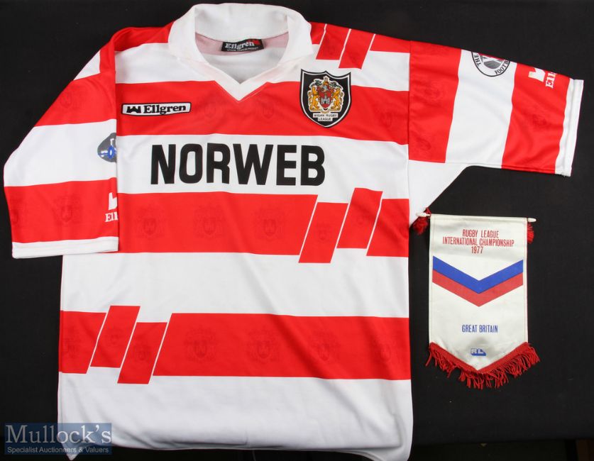 1994-95 Rugby League Multi Signed Ellgren Wigan Warriors Jersey: Red Norweb Home Rugby Size XL with signatures of Denis Betts, Kelvin Skerrett, Mark Crompton, Franco Botica & others, comes with a Great Britain Rugby League international championship 1977 pennant. VG