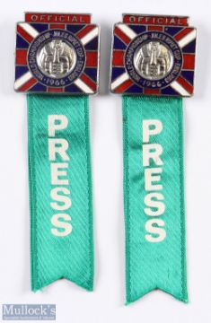 1966 Jules Rimet Cup - England official pin badges enamel/metal with green ribbon with 'PRESS' printed thereon issued for the 1966 World Cup matches at Old Trafford. (2)