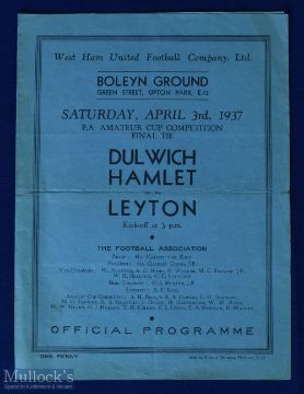 1937 FA Amateur Cup final Dulwich Hamlet v Leyton at West Ham Utd 3 April 1937, 4 pager; fair condition.