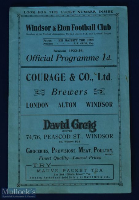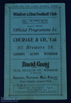 Pre-war 1933/1934 Windsor & Eton v Crittall Athletic match programme 11 November 1933, Spartan league; fair condition. (1)