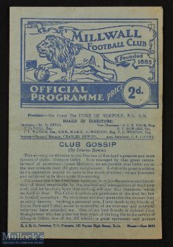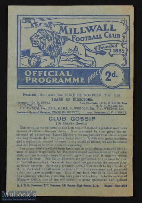 1948/49 Millwall v Glasgow Celtic benefit match programme 25 April 1949 at The Den, 4 pager; slight crease, o/wise good. (1)