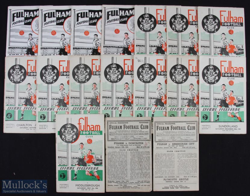 Fulham home match programme selection to include 1946/47 Birmingham City (FAC), 1947/48 Doncaster Rovers (FAC), 1949/50 Middlesbrough, 1950/51 Sunderland, Wolves, Derby County, Aston Villa, Sheffield Wednesday (FAC), Blackpool 1952/53 Leicester City 1953/54 Blackburn Rovers, 1954/55 Stoke City, Bury, Plymouth Argyle (Sellotaped spine), 1957/58 Blackburn Rovers, Bristol Rovers (FAC), 1958/59 Brighton, Birmingham City, Peterborough Utd (FAC), 1959/60 Hull City (FAC), 1960/61 Leicester City, Sheffield Wednesday, Wolves, Burnley, Chelsea, 1961/62 Blackburn Rovers, Port Vale (FAC), Sheffield Utd 1962/63 Blackpool, Sheffield Wednesday, 1964/65 Reading (FLC), Millwall (FAC),Everton, 1965/66 Northampton Town (FLC), Newcastle Utd, 1966/67 Kilmarnock (friendly), Sheffield Utd (FAC), Blackpool, 1967/68 Tranmere Rovers (FLC), Portsmouth (FAC), Macclesfield (FAC), Huddersfield Town (FLC), Manchester City (FLC), Burnley, 1968/69 Millwall, 1969/70 Orient (FLC), Leeds Utd (FLC), Doncaster Rovers, 1970/71 QPR (FLC), Orient (FLC), Doncaster Rovers, 1971/72 Manchester Utd (friendly), Coventry City (friendly), QPR, Oxford Utd, Preston NE, QPR (FAC), 1972/73 Middlesbrough, Luton Town, Sunderland, Brighton, Blackpool, Nottingham Forest, Aston Villa, Huddersfield Town, Preston NE, QPR, Portsmouth, 1973/74 WBA, Cardiff City, Sheffield Wednesday, Luton Town, Oxford Utd, Leicester City (FAC), 1974/75 Blackpool, Hull City, Nottingham Forest (FAC) (Feb), Nottingham Forest (FAC) (January), Hull City (FAC), Orient, Bristol City, Manchester Utd, Bolton Wanderers, WBA, York City, Aston Villa, Oldham Athletic, Sheffield Wednesday, Hull City, Cardiff city, Notts. County, WHU (FLC), 1975/76 Portsmouth, Peterborough Utd (FLC), Rest of GB (Haynes testimonial), 1976/77 Oldham Athletic, 1978/79 Sunderland, Brighton, Manchester Utd (FAC); o/all fair condition. (100+)