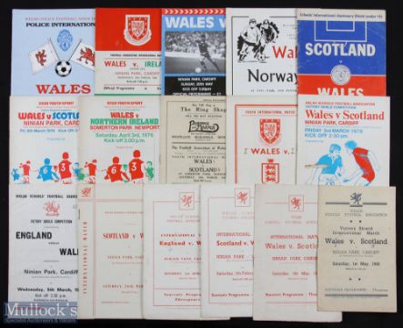 Selection of Wales junior international match programmes to include schools, 1948 Scotland, 1950 Scotland, 1954 Scotland, 1955 England, 1960 Scotland, 1975 England, 1978 Scotland; Youth 1950 Scotland, 1957 England (Greaves scores 4), 1976 N. Ireland, Scotland, 1976 Scotland (at Falkirk); U21s level 1982 Norway, 1990 Poland; U23s level 1968 Ireland plus police international 1992 Wales v Scotland; varied condition. (16)