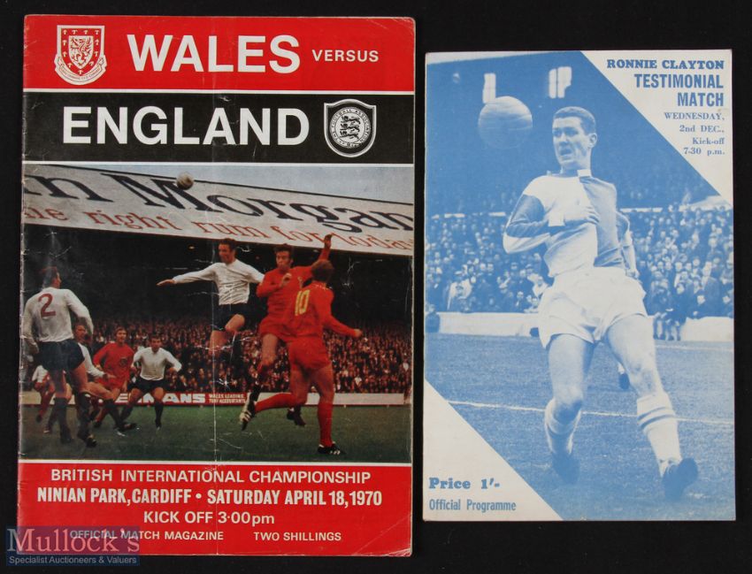Autographed programmes 1970 Wales v England at Cardiff with clear signature of George Best on back page: 1970 Ronnie Clayton testimonial programme Manchester City/Liverpool XI v International XI with clear signature of Bobby Moore (good) plus Keith Newton, Emlyn Hughes & Geoff Hurst (2)