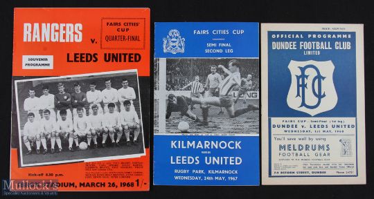 1960s Leeds Utd European away programmes in Scotland to include 1966/67 Kilmarnock (ICFC s/f), 24 May 1967; 1967/68 Rangers (ICFC ¼ final) 26 March 1968; 1967/68 Dundee (ICFC s/f) 1st May 1968; fair/good. (3)