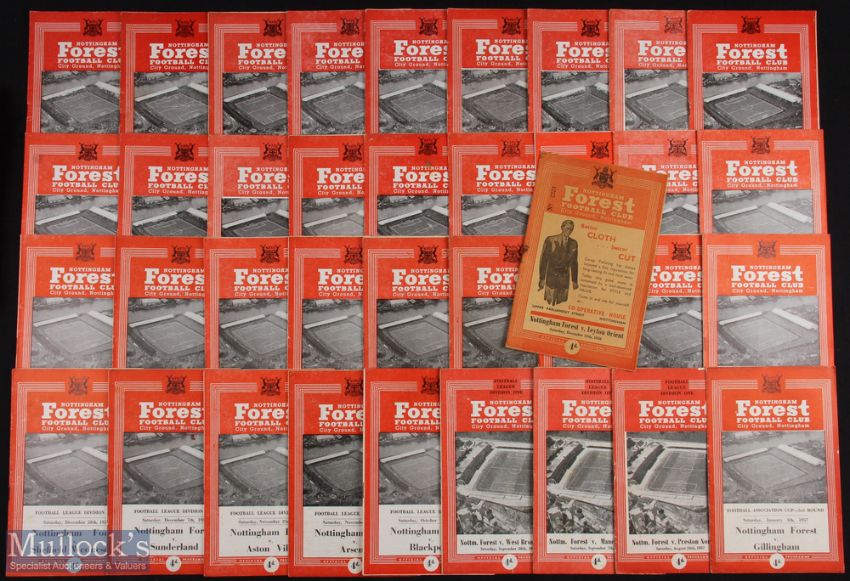Collection of Nottingham Forest home match programmes to include 1956/57 Leyton Orient, Gillingham (FAC), 1957/58 Preston NE, Manchester City, WBA, Blackpool, Arsenal, Aston Villa, Sunderland, Sheffield Wednesday, Newcastle Utd, Tottenham Hotspur, Portsmouth, Leicester City, Bolton Wanderers, Chelsea, Luton Town, Everton, WBA (FAC), Wolves, 1958/59 Blackpool, Cardiff City reserves, Luton Town, Everton, Preston NE, Newcastle Utd, Manchester City, WBA, Wolves, Bolton Wanderers, Burnley, Leicester City, Bolton Wanderers (FAC), Grimsby Town (FAC), Tooting & Mitcham (FAC), Blackburn Rovers, Birmingham City (FAC), Birmingham City 1959/60 Bolton Wanderers, Chelsea, Leicester City, Leeds Utd, Everton, St. Mirren (friendly), Sheffield Wednesday, WBA, Blackburn Rovers, Birmingham City, Arsenal, Blackpool, Burnley, Preston NE, Newcastle Utd, Luton Town, Reading (FAC), Tottenham Hotspur, Wolves, 1960/61 Bolton Wanderers, Everton, Chelsea, Preston NE, Sheffield Wednesday, WBA, Blackburn Rovers, Blackpool, Burnley, Cardiff City, Leicester City, Manchester Utd WHU, Birmingham City (FAC), Birmingham City, Wolves 1961/62 Bolton Wanderers, Chelsea, Sheffield Utd, Tottenham Hotspur, Valencia (international challenge), WBA, Birmingham City, Blackburn Rovers, Sheffield Wednesday (FAC), Blackpool, Everton, Manchester City, Sheffield Wednesday, Arsenal, 1966/67 Everton (FAC); varied condition, o/all fair condition. (88)