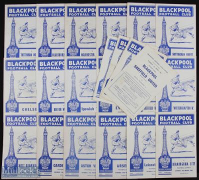 Blackpool comprehensive collection to include home match programmes 1958/59 league (20) excluding Manchester Utd, including Wolves, Chelsea, Leeds Utd, also Luton Town (FAC); 1959/60 league (21) including Burnley, Manchester Utd, WHU also Mansfield Town (FAC), Blackburn Rovers (FAC), 1960/61 league (20) excluding Sheffield Wednesday, Burnley, including Spurs, Manchester Utd, Wolves (January-postponed); 1961/62 league (21) including Ipswich Town, Spurs, Sheffield Utd (single sheet) also Port Vale (FLC); 1962/63 league (21) including Spurs, Everton, Leyton Orient, also Norwich City (FAC) (single card), 1963/64 league (20) excluding Birmingham City, including Liverpool, Manchester Utd 1964/65 league (21) including Manchester Utd, 1965/66 league (21) including Liverpool, Northampton Town, also Gillingham (FLC), 1966/67 league (20) excluding Fulham, including Manchester Utd, also Chelsea (FLC) Fulham (FLC), 1967/68 league (21) including Ipswich Town, also Chesterfield (FAC), Manchester city (FLC); 1968/69 league (20) excluding Charlton Athletic, includes Derby County; 1969/70 league (21) including Huddersfield Town, also Gillingham (FLC); fair/good condition. (1 box of 250+)