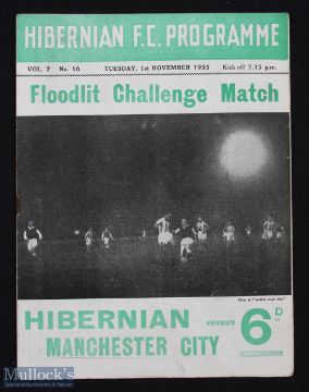 1955/56 Hibernian v Manchester City (floodlit challenge match) programme at Easter Road 1 November 1955; slight crease, score on team page 2-1. (1)