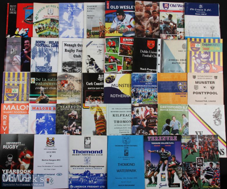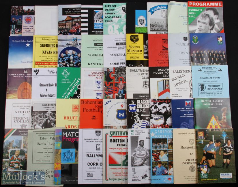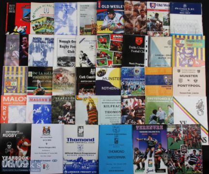 Irish Club Rugby Programmes (c.80): Fine wide selection, 1960s to 2000s, first class and well below, to inc Bective Rangers v Ebbw Vale 03/1966, Connaught v Beziers 10/2000 Dublin University v UC Dublin 11/1964, Munster v Pontypool 09/1991 & Wanderers v Coventry 10/1983. VG