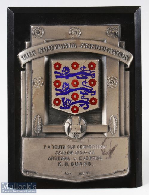1964/65 FA Youth Cup Competition Arsenal v Everton silver and enamel plaque awarded to K H Burns, mounted on black stand, width 9cm