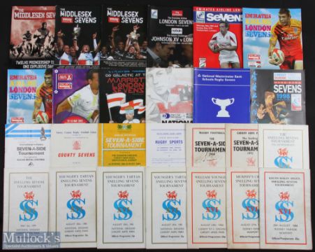 Sevens Rugby Programme Selection (35): Middlesex Sevens, Prelims 1958 & 1967, Main Event 1963, 1980, 1984, 1997, 2000, 2004, 2007, 2009-10 inc; Snelling Welsh Sevens, 1968, 1972, 1978-81(2) inc, 1982-4 inc; London Sevens 2001, 2004-5 inc; 2007, 2011(2), 2012 & 2015; Scots South District Sevens at Hawick 1987; Cardiff HSOB 7s 1984; Surrey County 7s 1968; Bridgend Centenary 7s (many autogs) 1978; Hong Kong Results Sheet 1998; and National Schools Sevens 1984 & 1987. Generally VG