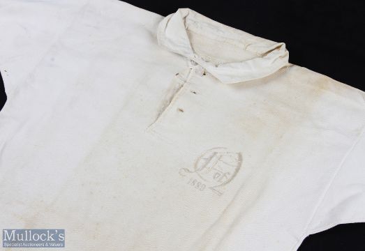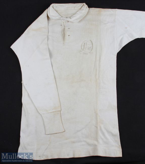 Rare 1889 North of England v South Trial Match Rugby Jersey: White with collar, calligraphic 'N of E 1889' embroidered badge, long sleeve, signs of discolouration, purportedly worn by C Anderton, England 1889 and Manchester FC (Rugby). No number to reverse, no labels apparent internally. Very desirable