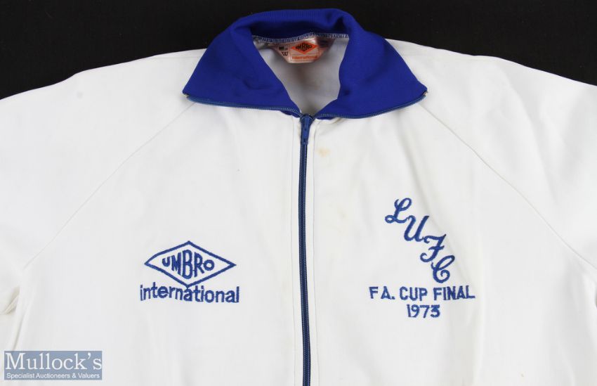 1973 FAC final Leeds United Umbro track suit top, white with zip up front, blue lettering, TERRY COOPER to the reverse. (1) Note: From direct descendant of the family