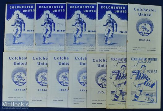 Collection of Colchester Utd home match programmes to include 1951/52 Shrewsbury Town, 1952/53 Llanelly (FAC), 1953/54 Millwall (FAC), 1954/55 Bournemouth, 1955/56 Watford, Gillingham, Shrewsbury Town, QPR, 1956/57 Radnicki (Yugoslavia) (friendly), 1958/59 Bradford City, Chesterfield (FAC), Newport County, Swindon Town, 1959/60 QPR (FAC), 1961/62 Carlisle Utd, 1962/63 Millwall, 1963/64 Mansfield Town, Reading, Fulham (FLC, 1964/65 Port Vale, QPR, Bideford (FAC), Torquay Utd (FLC), Bournemouth, 1965/66 Newport County, QPR (FAC), Exeter City (FLC), 1966/67 Peterborough Utd, 1967/68 Torquay Utd (FAC), 1968/69 Ipswich Town (Macedo testimonial), Reading (FLC), 1969/70 Reading (FLC), 1970/71 Workington, Leeds Utd (FAC), Rochdale (FAC, 4 pager), 1971/72 Aldershot, Brentford (FLC), 19972/73 Bournemouth (FAC, 4 pager), Hartlepool, 1974/75 Bonner SC (Germany) (friendly), Oxford Utd (FLC); fair/good condition. (41)