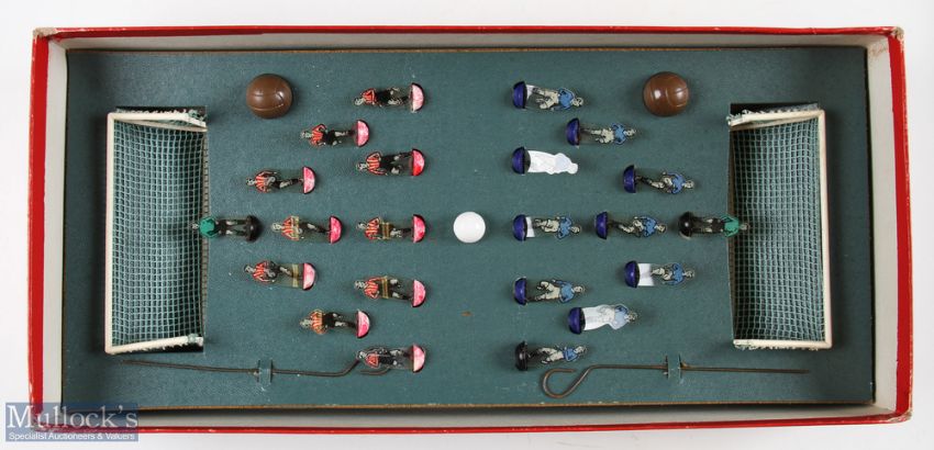 1953-54 Newfooty Boxed De Luxe table soccer game, complete with goal ball, clips, cord pitch literature and two teams in red and white shirts - black shorts, blue shirts white shorts G