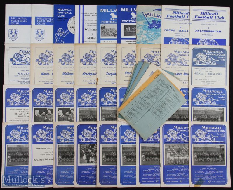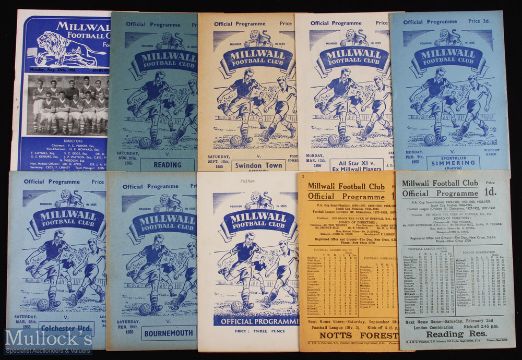 Millwall home match programme selection to include 1945/46 Aston Villa (FAC), 1947/48 Chesterfield, 1950/51 Fulham (FAC), 1954/55 Bournemouth, Colchester Utd, SC Simmering (friendly), 1955/56 Reading, Swindon Town reserves, All Star XI (benefit match), 1956/57 Shrewsbury Town, Swindon Town (slight Sellotape), Bournemouth, Aldershot, Banik Ostrava (friendly), Crystal Palace (FAC), Birmingham City (FAC), Charlton Athletic v Watford (Southern floodlit cup replay at The Den), 1957/58 Port Vale (ph), Southampton, Sunderland (friendly), Southend Utd, Northampton Town, Exeter City, Plymouth Argyle, Colchester Utd, Torquay Utd 1958/59 Walsall, Torquay Utd, 1959/60 Doncaster Rovers, Crewe Alexandra, Stockport County December (postponed), Torquay Utd, Stockport County, Oldham Athletic, Notts. County, 1961/62 Walsall (FLC), 1963/64 Peterborough Utd, Crewe Alexandra, Southend Utd, 1964/65 Fulham (FAC), Hartlepools Utd, 1965/66 Workington (CCTV from Borough Park), 1966/67 Huddersfield Town, 1968/69 Middlesbrough (FAC), Middlesbrough; fair/good condition. (45)