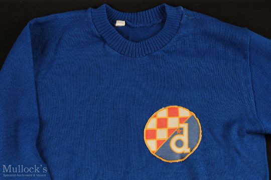 DESCRIPTION AMENDMENT – c1975 Middlesbrough v Dynamo Zagreb match issue football shirt in blue, crew neck, wool texture, purportedly from Frank Spraggon testimonial match.