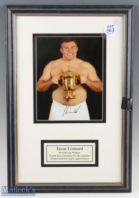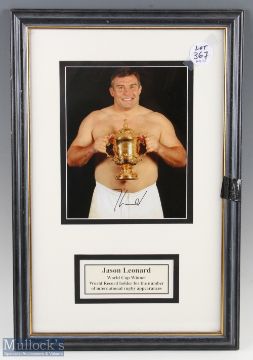 2003 Jason Leonard with Rugby World Cup Framed Signed Photograph: 57cm x 37cm topless with shorts pic of the most-capped Englishman and future RFU President holding the World Cup he and his teammates had won. VG