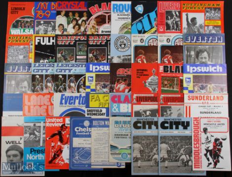 Selection of football programmes to include 1953/54 Chelsea v Bolton Wanderers, Bolton Wanderers v Sheffield Utd, 1954/55 Birmingham City v Bolton Wanderers (FAC), 1956/57 Blackpool v Bolton Wanderers, Manchester City v Bolton Wanderers, Birmingham City v Bolton Wanderers, Wolves v Bolton Wanderers, WBA v Bolton Wanderers, 1957/58 Birmingham City v Bolton Wanderers, 1958/59 Preston NE v Bolton Wanderers, WBA v Bolton Wanderers, 1959/60 Fulham v Bolton Wanderers (ph), 1960/61 Sunderland v Spurs (FAC), 1961/62 Sunderland v Bury v Port Vale (FAC), 1968/69 Sunderland v Verona v Naples, 1969/70 Sunderland v Bradford City (FLC), v Newcastle Utd (Ashhurst testimonial), 1971/72 Preston NE v Spurs (FLC replay), 1970/71 Everton v Liverpool, 1972/73 Sheffield Wednesday v Chelsea (FAC), 1973/74 Burnley v Southampton, Liverpool v Newcastle Utd v Manchester City, Spurs v Manchester City, Sheffield Utd v Burnley, 1974/75 WHU v Everton, Liverpool v Luton Town, Manchester City v Middlesbrough x 2, Ipswich Town v QPR x 2, Arsenal v Burnley, Middlesbrough v Newcastle Utd, Oldham Athletic v Southampton (Texaco s/f), 1975/76 Sheffield Utd v Burnley, Manchester City v Newcastle Utd, 1976/77 Liverpool v Crystal Palace (FAC), Manchester City v Leeds Utd x 2, Everton v Liverpool x 2, Leicester City v Coventry City x 2, Manchester Utd v Arsenal, v QPR (FAC), Fulham v Plymouth Argyle, Bristol City v Derby County, v Liverpool, 1977/78 Nottingham Forest v Derby County v Manchester City (FAC), Liverpool v Middlesbrough, Leicester City v Arsenal, Sheffield Utd v Arsenal (FAC), Blackburn Rovers v Mansfield Town, Crystal Palace v Spurs, 1978/79 Coventry v Spurs, Lincoln City v Walsall; fair condition. (59)