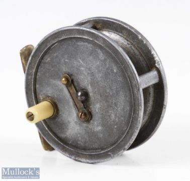 J J S Walker Bampton 3” alloy fly reel, cream handle, brass spool latch, makers marks to rear, brass foot, constant check, runs smooth, shows overall signs of wear