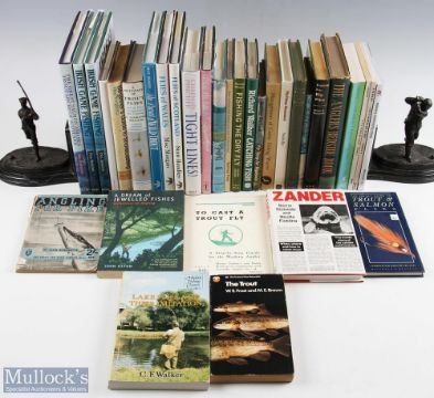 A Collection of Fishing Books, to include the anglers bedside book Maurice Wiggin 1965, the pursuit of wild Trout Mike Weaver 1991, flies of Wales Moc Morgan 1996, flies of Scotland Stan Headley 1997, the great Salmon and sea Trout of Lochs of Scotland Bill Rawlings 2006, fishing for big Pike Barrie Rickards 1971, Conrad Voss Bark on fishing 1989, pocket guide to Trout& Salmon flies, Salmon and sea trout in wild places Sidney Spencer 1968, how to build & repair your own fishing rod G Lawton Moss 1969, fishing the dry fly Dermot Wilson 1981,catching fish Richard Walker 1981, fly tying for beginners Geoffrey Bucknall 1967, fly fishing J R Hartley 1994, beginners guide to shorecasting Ray Forsberg 1974 ex lib, a dictionary of Trot flies A Courtney Williams 1968, coarse fishing with experts John Norman 1957-missing D/j, the first Trout Season John Tonking 1981, Zander Barrie Rickards 1979, Fly fishing illustrated Freddie Rice 1976, the management of coarse fishing waters Eric Birch 11964, tight lines Chapman Pincher 1997, Irish game fishing Paul Sheehan 1997 x 2, (all of the above books are H/b with most having D/j Plus a paperback selection of fifty popular flies Vol 3 and 4 Tom Stewart, Britain’s freshwater fishes Mark Everard 2013, lake flies and their imitation C F Walker 1983, The Trout W E Frost 1967, angling for Pike J Bickerdyke -worn, a dream of jewelled fishes John Aston 2008, to cast a Trout Fly Farlows + Hardy publication fishing’s strangest days Tom Quinn 2002, (30)