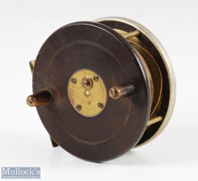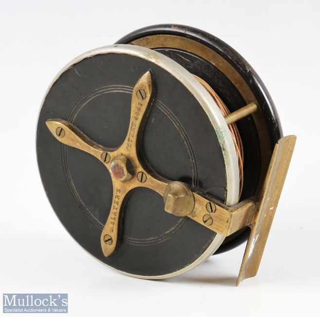 D Slater 4 ¼” ebonite and brass star back reel, twin horn handles, brass star back and foot, rear check on/off, makers and patent marks to rear, runs smooth, good overall