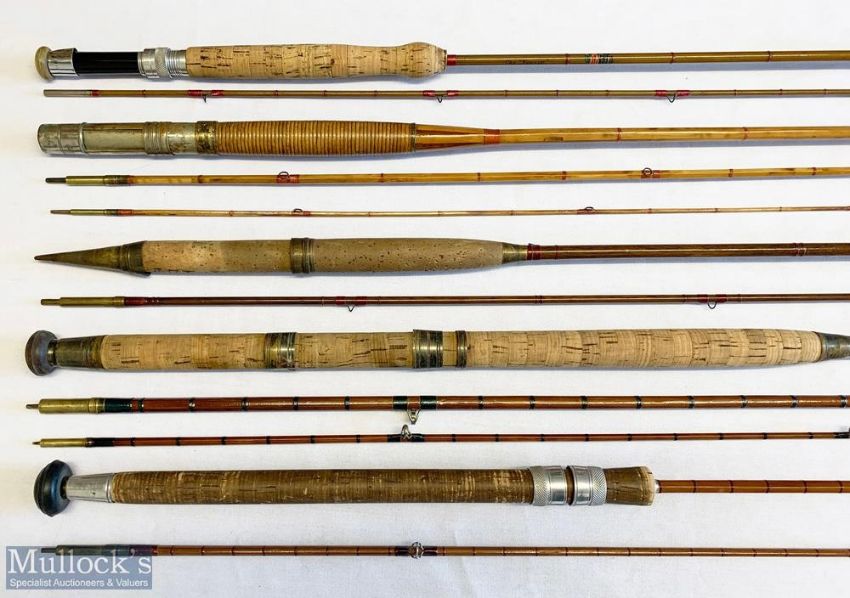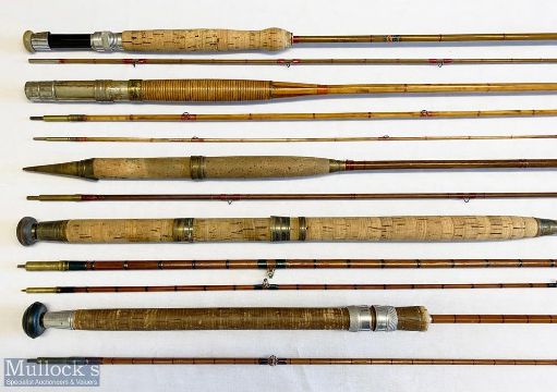 5x Various split can fishing rods – featuring John Macpherson & Sons The Kennett 9ft 2pc, Unnamed American 10ft 5in 3pc, Ogden 10ft 2pc green heart with cone style butt spike, Milward 10ft 3pc ¾ rewhipped and an Unnamed 7ft 6in 2pc split cane – mixed condition A/G – all with cloth bags