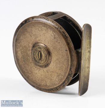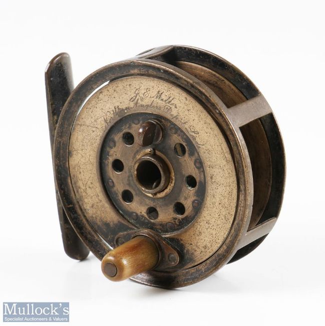 Moscrop Patent 3” J E Miller Northern Anglers Depot Leeds brass reel, horn handle with brass foot, overall signs of wear with slight bends to the spool face and rear flange, slight rim catching otherwise runs smooth