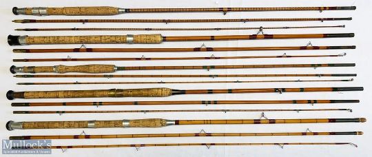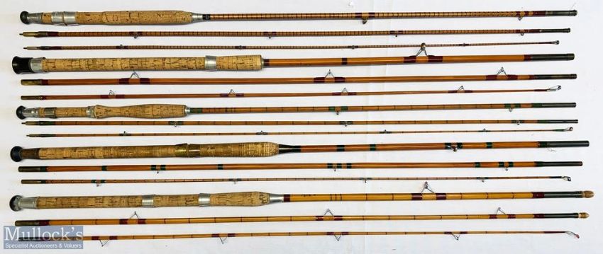 5x Various split cane fishing rods – featuring Milbro 10ft 6in 3pc split cane, Milbro Paragon 10ft 6in 3pc split cane, Milbro Supreme 10ft 6in 3pc split cane, Milbro 10ft 6in 3pc whole cane with split cane tip and Milbro Paragon 10ft 6in 3pc split cane – mixed A/G condition – all with cloth bags