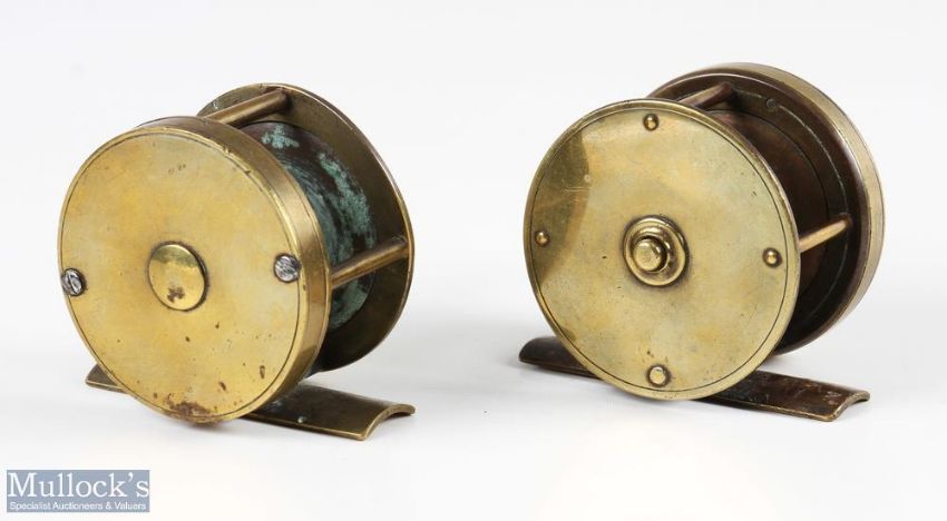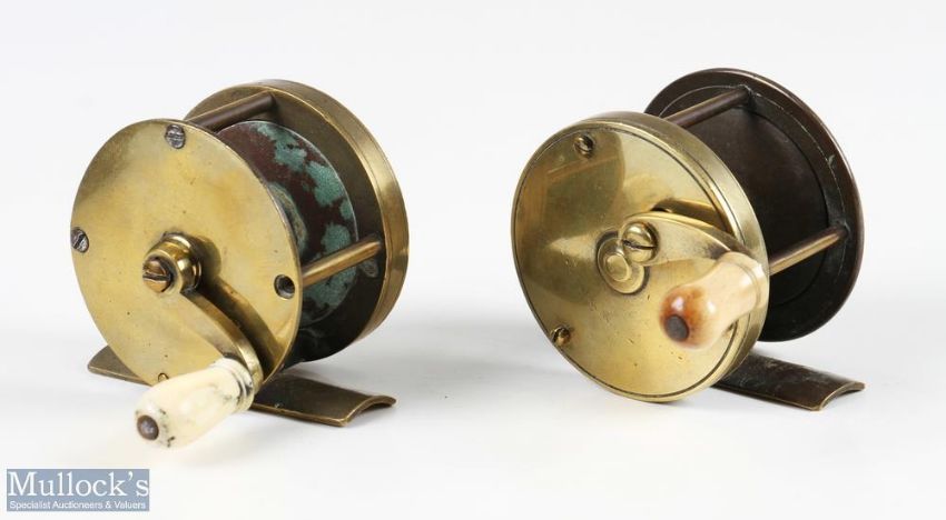 Two brass unnamed reels, 2 ¼” multiplier reel, original handle with shaped handle, brass foot, together with 2 ¼” winch reel, cream handle, brass foot, slipping check, one pillar screw head missing (2)