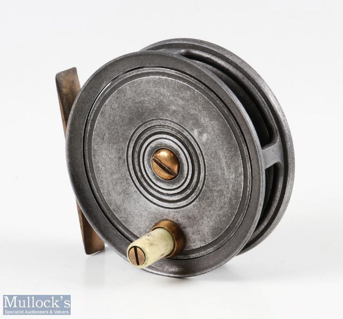 Unnamed 3” alloy trout fly reel, cream handle, brass centre screw and foot, marked to rear Made in England, constant check, runs smooth, overall good