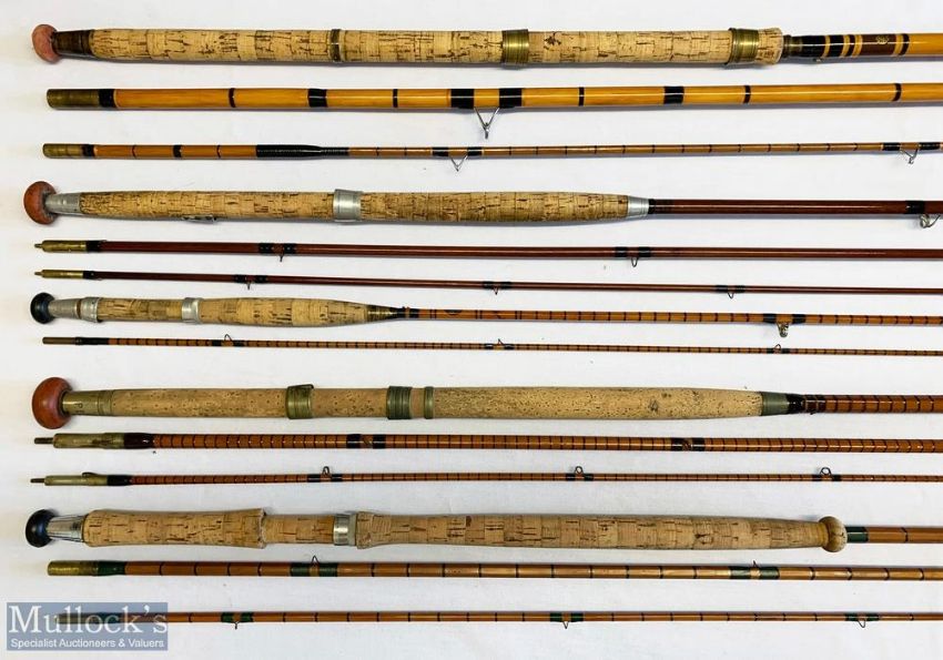 5x Various antique fishing rods – including Marvella 13ft 3in 3pc whole cane/split cane tip rod, J Somers 12ft 3pc green heart, Rudge The Master 8ft 8in 2pc split cane rod, Thorburn 13ft 8ft 3pc and Salmo-Salar 13ft 3pc split cane – mixed condition A/G – all with cloth bags