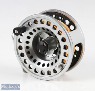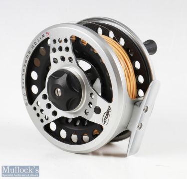Airflo Switch Superlite 7/9 alloy fly reel, black counterbalance handle, rear tension adjuster, run smooth overall good, with 4 spare spools in a sectioned Airflo case