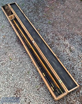 Bernard Church Place Piccadilly 19ft 4pc green heart salmon rod with spare tip all with drop rings with brass fittings and ferrule sections plus hollow bamboo tip tube and landing net handle (with net), encased within wooden rod holder measuring 205cm in length