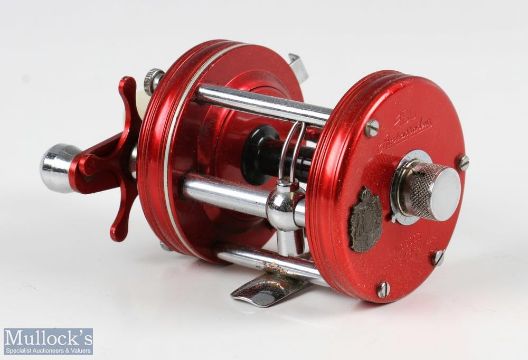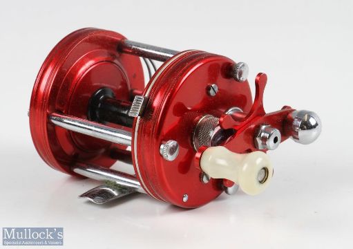 ABU Ambassadeur 6000 multiplier reel, in red, numbered to foot unnumbered, drag adjuster to end, sliding line guide, runs smooth, with makers brown case with tube of spares, oil bottle and spanner