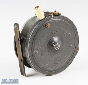 Dingley for Westley Richards The Rolo 4 ¼” alloy reel, twin ivorine handles, quarter rim cut out with owners initials to front, cream handle, rim brake, strapped tension adjuster, rim check on/off, pillar drum core, brass foot, makers marks to rear, internally stamped D1172, runs smooth, overall good