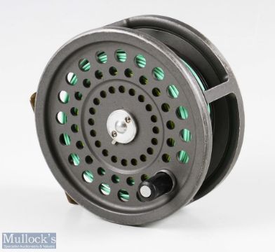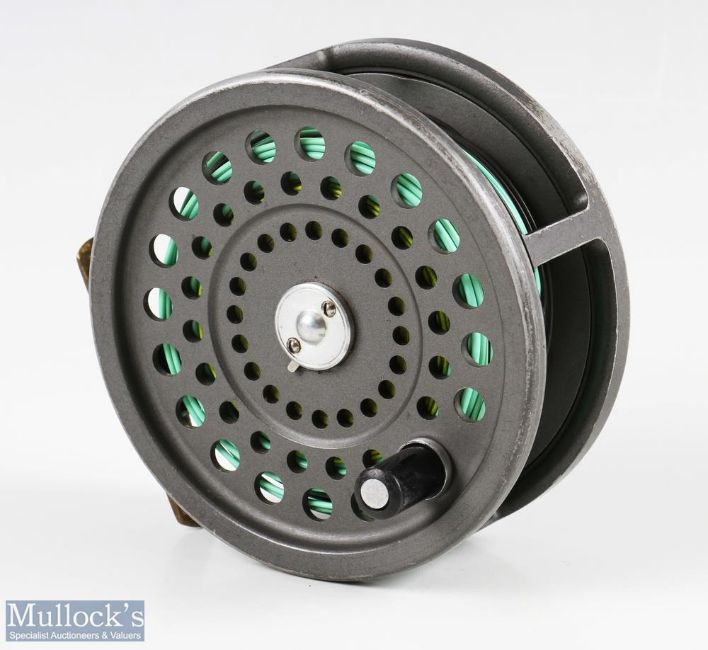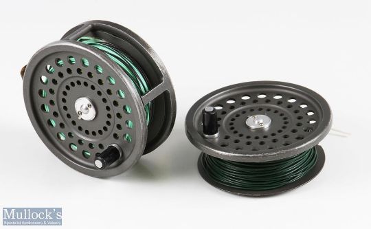 Hardy Bros, England Marquis Salmon No.2 alloy fly reel, black handle, rear adjuster, ribbed brass foot, constant check, runs smooth, together with spare spool (2)