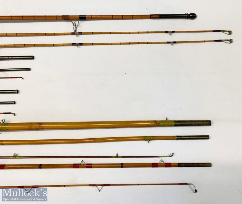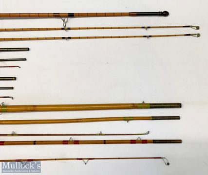 5x Various Antique fishing rods – featuring unnamed 10ft 5in 2pc with spare tip section, 8ft 6in 3pc greenheart, 10ft 3in unnamed 3pc split cane, Martin James 15ft 6in 3pc cane rod, and 10ft 3in 2pc split cane – mixed condition overall A/G – no bags