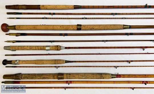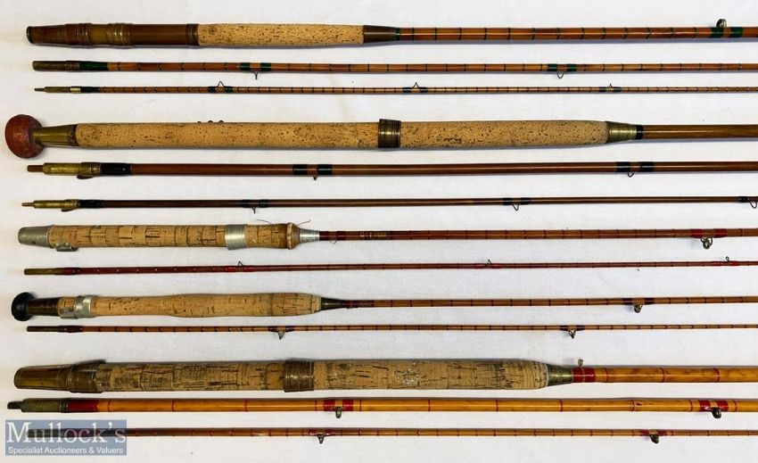 5x Various antique fishing rods – to include W Haynes & Son Cork 12ft 3pc split cane, Holbrow & Co 12ft 6in 3pc green heart, Hamlin 8ft 6in 2pc split cane, Hamlin 6ft 4in 2pc split cane, W Haynes & Son Cork 9ft 9in 3pc whole cane rod – condition mixed A/G – with cloth bags