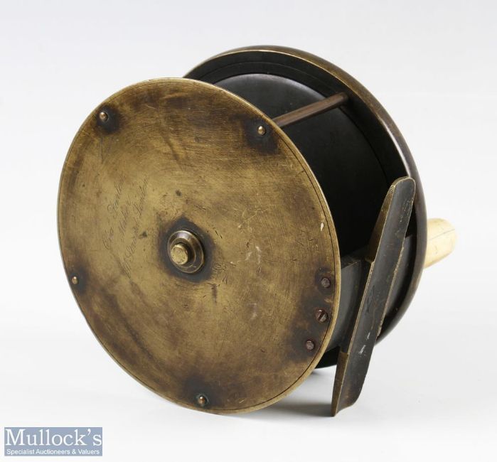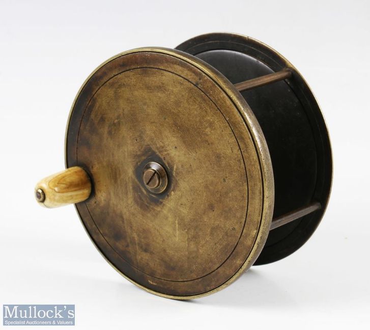 Chas Farlow, 191 Strand London 4 ¾” brass salmon reel, makers marks in script to rear, fat bone handle, brass foot with fish logo to top, runs smooth, constant check