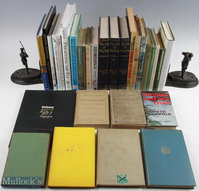 A Collection of Modern +Vintage Fishing Books, to include fly fishing for bass LL Bean 2000 P/b, angling in the Laerdal River John Bruvoll 1996, Farlow’s 175th anniversary P/b flies that catch fish Terry Lawson 2009, 2004 guide to angling in south west England, fly dressing innovations Richard Walker 1974, match fishing and baits Bill Baartles,1979, fly dressing II DJ Collyer 1981, anglers almanac G Brown 1949 (x lib), fishing compass book No.6the complete fly fisher P Lapsley 1990, Trout & salmon flies of Ireland Peter O’Reilly 1996 signed copies, the world’s best Trout flies J Roberts 1994, presenting the fly Lefty Kreh 1999, modern fly fishing Larry Solomon P/b the art of angling vols 1-3 Kenneth Mansfield 1957 reprints, the anglers diary 1908 and 1910 , dry fly revolution F M Halford 2002, angling year book 1972, better angling with simple science Mary M Pratt 1975, shark angling in great Britain brigadier J A L Caunter 1961, roach and dace fishing E Ensom-missing D/j, new angles on coarse fishing H G C Claypole, we come from the sea A Houghton Broderick Salmon and sea Trout Kenneth Mansfield 1973, the witchery of water H G c Claypole 1970, going fishing Negley Farson- illustrated by C F Tunnicliffe 1943 (#30)