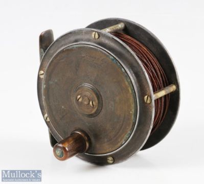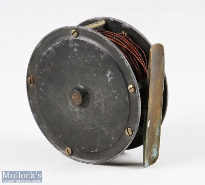 Anderson & Sons, Edinburgh 3 ½” brass and alloy Hercules style reel, script makers marks to face plate, horn handle, brass foot, overall signs of use with light corrosion, constant check, runs smooth