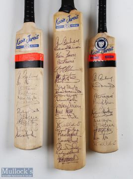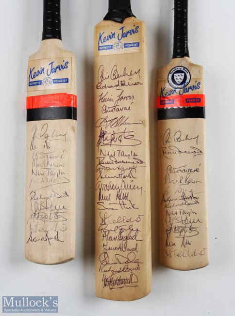 3x 1987 Kevin Jarvis Benefit Year Signed Miniature Cricket Bats featuring a host of players such as Derek Underwood, Simon Hinks, Richard Ellison, Kevin Jarvis, Eldine Baptiste, plus many others, all good, clean signatures