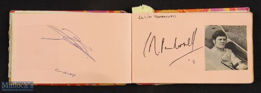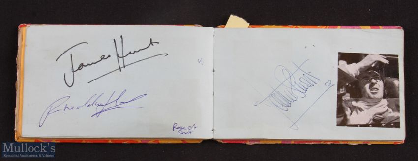 Motor Racing History - Quantity of Motorsport Autographs within Album - featuring Jackie Stewart (x2), James Hunt, Freddy Hunt (son of James), Nicki Lauda, John Surtees (F1 and motor cycle racer), Jack Brabham, Stirling Moss, Graham Hill, Damon Hill, Emerson Fittipaldi (F1 world champ), Reine Wisell (drove gas turbine F1 car), Mike Hailwood (motorcycle racer and racing driver), Colin Vandervell, Denny Hulme, Howden Ganley (F1), Pierre Soukry, Johnny Herbert, Ian Tyrell (F1 owner), Jos Verstappen (F1 driver and father of Max), Tom Walkinslaw (F1 owner and Rugby club owner, Roger Williamson, Ron Dennis (F1 McLaren owner), Ray Allen, Rob Wilson, Rene Arnoux, John Watson, Peter Gethin, Danny Sullivan, Ronnie Peterson (F1 died at Monza), Tom Pryce (Welsh F1 driver, died in USA), Brian Redman, Paul Belmondo (race driver), Howden Ganley (F1 driver), Dave Purley (crash survivor), Mark Surer, Rikky von Opel, Brett Lunger, Frank Gardner and many more, many back to back autographs - plenty of Motor Racing history contained within (#95 Signatures). Good retail potential - all obtained over many years as vendor attended events and meetings.