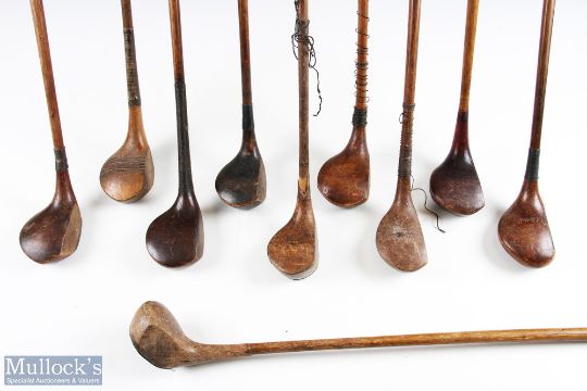 10x Various Golf woods - featuring Anderson & Sons Edinburgh brassie, W Brown Glasgow, with many indistinct or blank woods - 1x without grip - for repair of restoration A/F