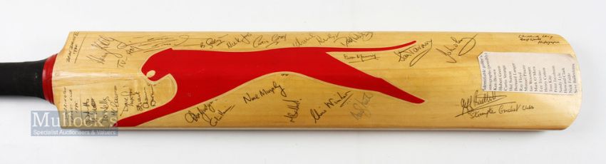 1985 Slazenger Cricket Bat signed by US Major, UK and European Golfers (31) - from the match between Brian Barnes XI and Storrington Cricket club - Curtis Strange Lanny Wadkins, Hal Sutton, Bernhard Langer, Calvin Peete, Ray Floyd, Mark O'Meara, Ian Woosnam, Lee Trevino, Tom Kite, Peter Jacobsen, Sandy Lyle, Nick Faldo, Seve Ballesteros, Vivian Jacklin, Herbert Green, Ken Brown, Manuel Pinero, Henry Cotton, Howard Clark, Sam Torrance, Euan Murray, Brian Barnes, Henry Kelly (TV-AM) et al - I didn't realise that there so many famous American golfers who played cricket
