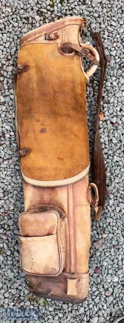 The Ritchie Leather Golf Bag and Contents  - complete with travel hood, ball pocket, umbrella holder, and strap (frayed), together with an Avon rubber golf ball cleaner still with remnants of the original sponge; wooden cylinder tee holder the tees; a wrapped Spalding Red Dimple golf ball; 3x Royal Belfast Golf Club ladies scorecards; and a 1956 Rules of Golf booklet presented by Royal insurance company Liverpool devoid of staples which have perished et al - some minor faults, leather needs feeding and it should make a very presentable golf bag for the hickory player