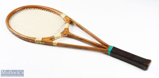 c1935 Hazells Streamline Green Star Wooden Tennis Racket, the famous triple branch racket, British Patent to the handle with a leather grip and butt cap, in good used condition, strings all fine, with some signs of wear to top of racket, with some signs of wear