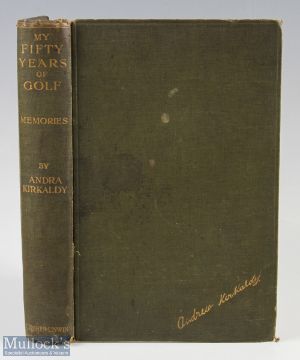 Kirkaldy, Andra - "Fifty Years of Golf: My Memories" 1st ed 1921 in the original green and gilt cloth boards and spine complete with Private library label from Mrs DJ Stirkk some speckle foxing otherwise comes with 21 various photograph illustrations and several golf advertisements to the rear, uncut edges to pages, a loose title page with signs of wear to board F